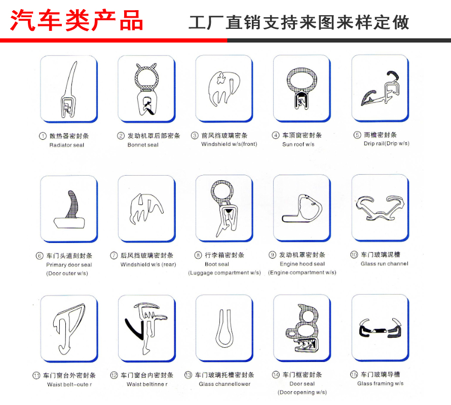 常用天候密封條有門框密封條、行李箱密封條、發(fā)動機箱蓋條等。常用一般密封條有前后風窗密封條和角窗密封條、內(nèi)外側(cè)條等。